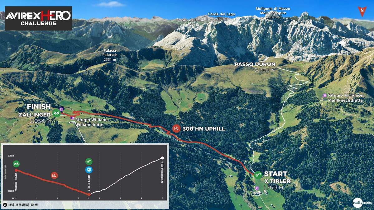 On the 60 km route, however, the challenge starts at Lupo Bianco and is timed until Passo Sella (3,600 m route and 510 meters of elevation gain). Those who complete the AVIREX HERO Challenge within 34 minutes for elite men and within 34 minutes for elite women, 42 minutes for hobby riders, and 39 minutes for licensed can consider themselves Top Guns in mountain biking.